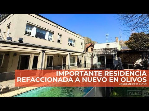 <p><span style="font-size: 14px; font-weight: bold;">IMPORTANTE RESIDENCIA REFACCIONADA a NUEVO en OLIVOS.</span></p><p><span style="font-size: 14px; font-weight: bold;">Excelente propiedad de categoría con muchos detalles de calidad. </span></p><p><span style="font-size: 14px;">Planta Baja: Se accede a un amplio hall de entrada que distribuye la recepción separada: el living de 5x12 con pisos de pinotea y techos altos, y el comedor con pisos de pinotea y muy buenas dimensiones (6 x 7). Toilette. Cocina moderna con mucha mesada y muebles, contiguo tiene un family/comedor diario muy práctico. Dependencia de servicio con su baño y lavadero. </span></p><p><span style="font-size: 14px;"> Planta Alta: la escalera de buen diseño y completamente de madera comunica a un hall de distribución hacia los 5 ambientes; los pisos son todos de pinotea en muy buen estado. La suite principal cuenta con vestidor; hidromasaje y un balcón. Hay una suite junior que es buenísima en dimensiones, también con vestidor y baño. Los otros 2 dormitorios están en semi-suite compartiendo baño. Y por último, el escritorio podría funcionar perfectamente como 5to dormitorio o estar. </span></p><p><span style="font-size: 14px;">Detalles: En cuanto a sus materiales y terminaciones, las aberturas exteriores son de PVC blancas con DVH; las interiores son todas de madera, algunas de las cuales tienen vidrio biselado repartido. El revestimiento exterior es en Tarquini. El techo es de zinc. </span><span style="font-size: 14px;">Baulera en entretecho.</span></p><p><span style="font-size: 14px;">Exterior: además del buen jardín privado (20 x 22) con riego x aspersión, cuenta con un quincho cubierto de de 3,20 x 5 con parrilla y baño completo. La pileta de natación tiene revestimiento de travertilit y filtro automatizado (3,5 x 8) En el jardín de adelante hay una fuente con agua. </span></p><p>Medidas del Terreno: <span style="font-size: 14px;">Fte: 24,21 m2 - </span><span style="font-size: 14px;">Lat.Izq: 39,71 m2 - Lat.Der.: 41,50 m2-</span></p><p><span style="font-size: 14px;">Gastos: </span><span style="font-size: 14px;">ARBA: $481.933 - </span><span style="font-size: 14px;">ABL: $ 106.027 - </span><span style="font-size: 14px;"> Aysa: $39.360 (Sept.2025)</span></p><div><br></div><div><br></div><div><br></div><p> <br> </p>